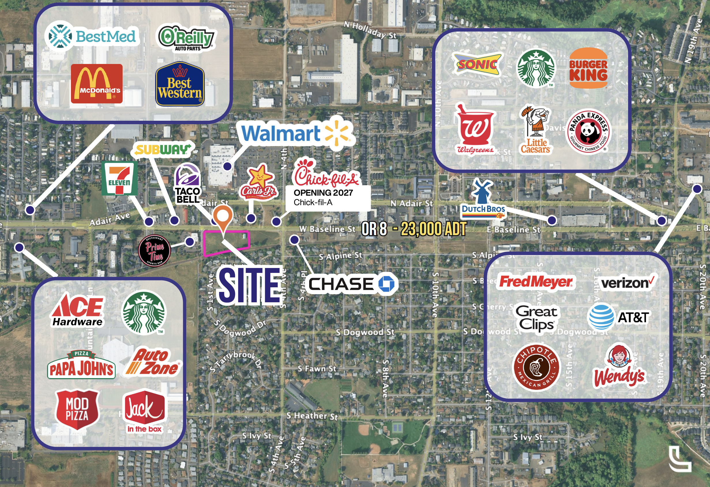 Signalized corner – ±23,000 ADT at W Baseline St & S 1st Ave
