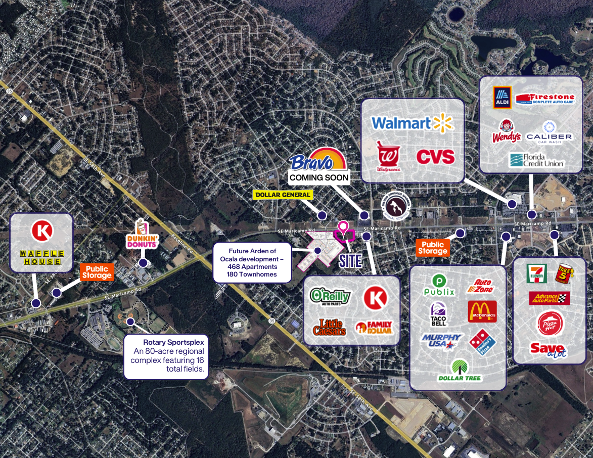 Retail synergy – Surrounded by national brands including Walmart, Aldi, Publix, McDonald’s, and Walgreens